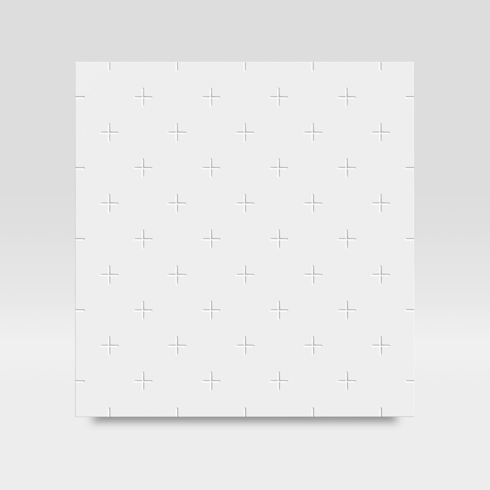 Die mit geringer Tiefe eingravierten Plus-Zeichen erzeugen die Illusion von Weichheit auf einer harten Oberfläche – wie man sie von eleganten Polstermöbeln kennt.