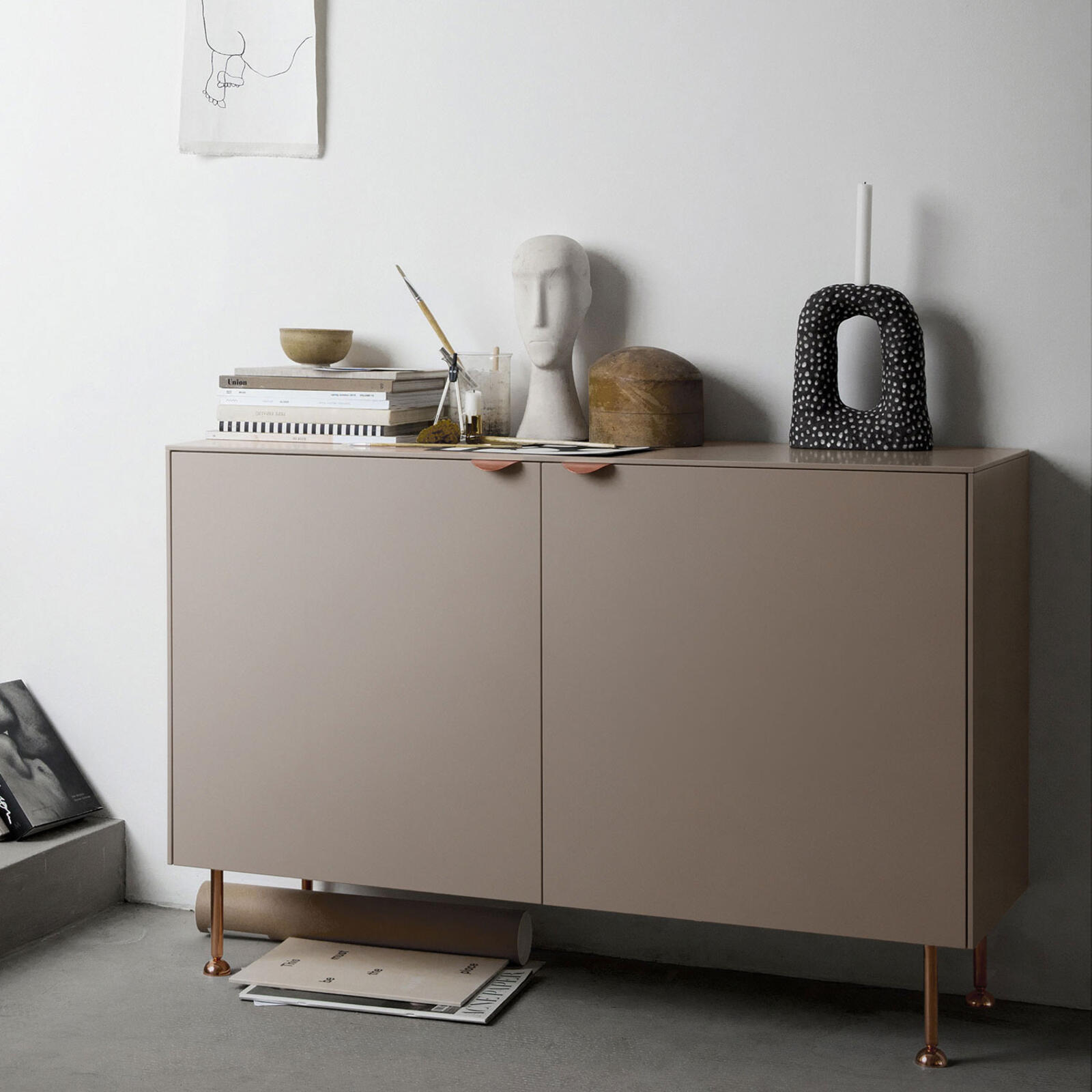 Ein zeitloses und einfaches Sideboard mit glatten Türen. Eine gute Wahl, wenn Sie vor allem die Griffe in Szene setzen möchten, oder um Ihren Möbeln einen puristischen, diskreten Look zu verleihen.