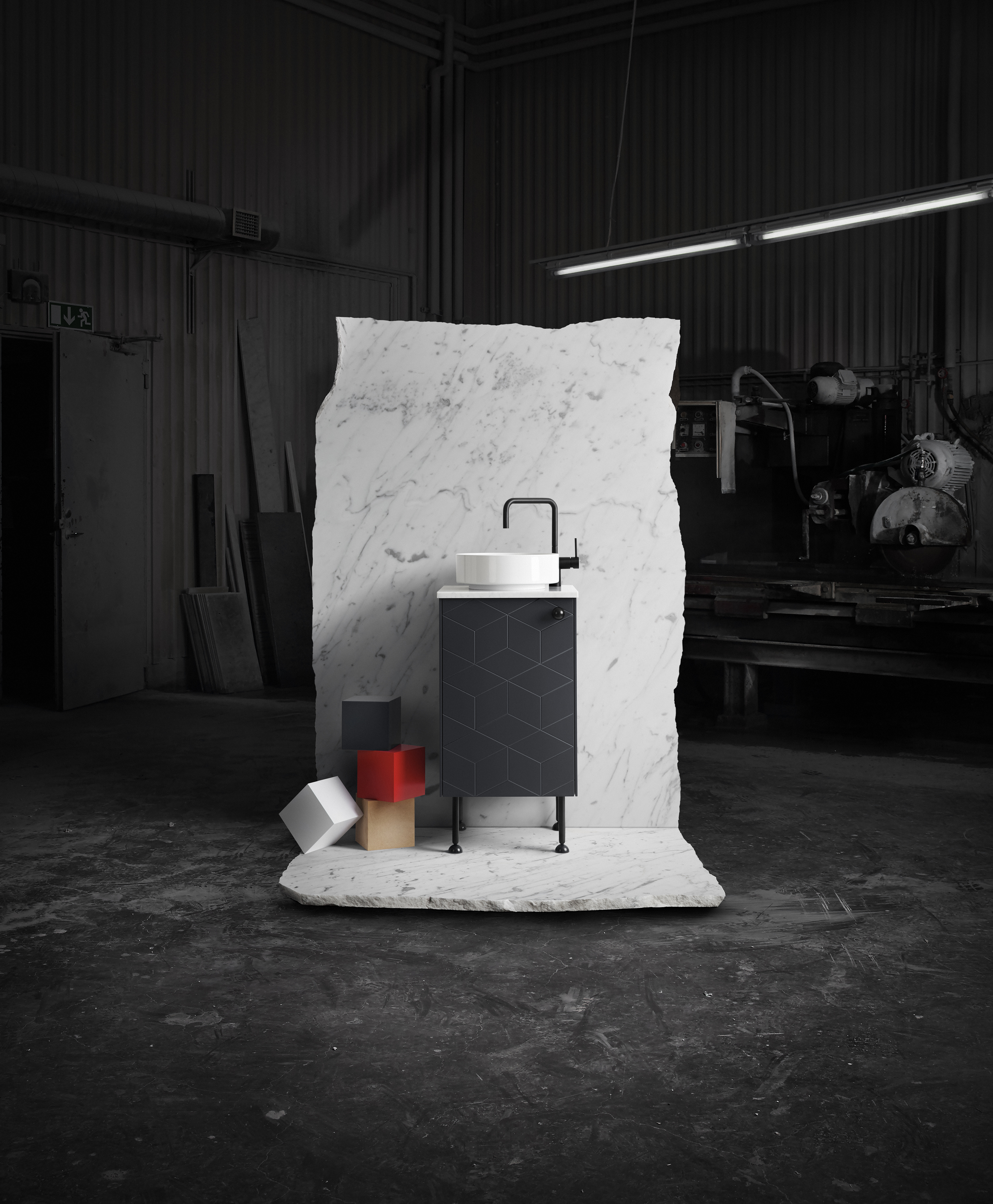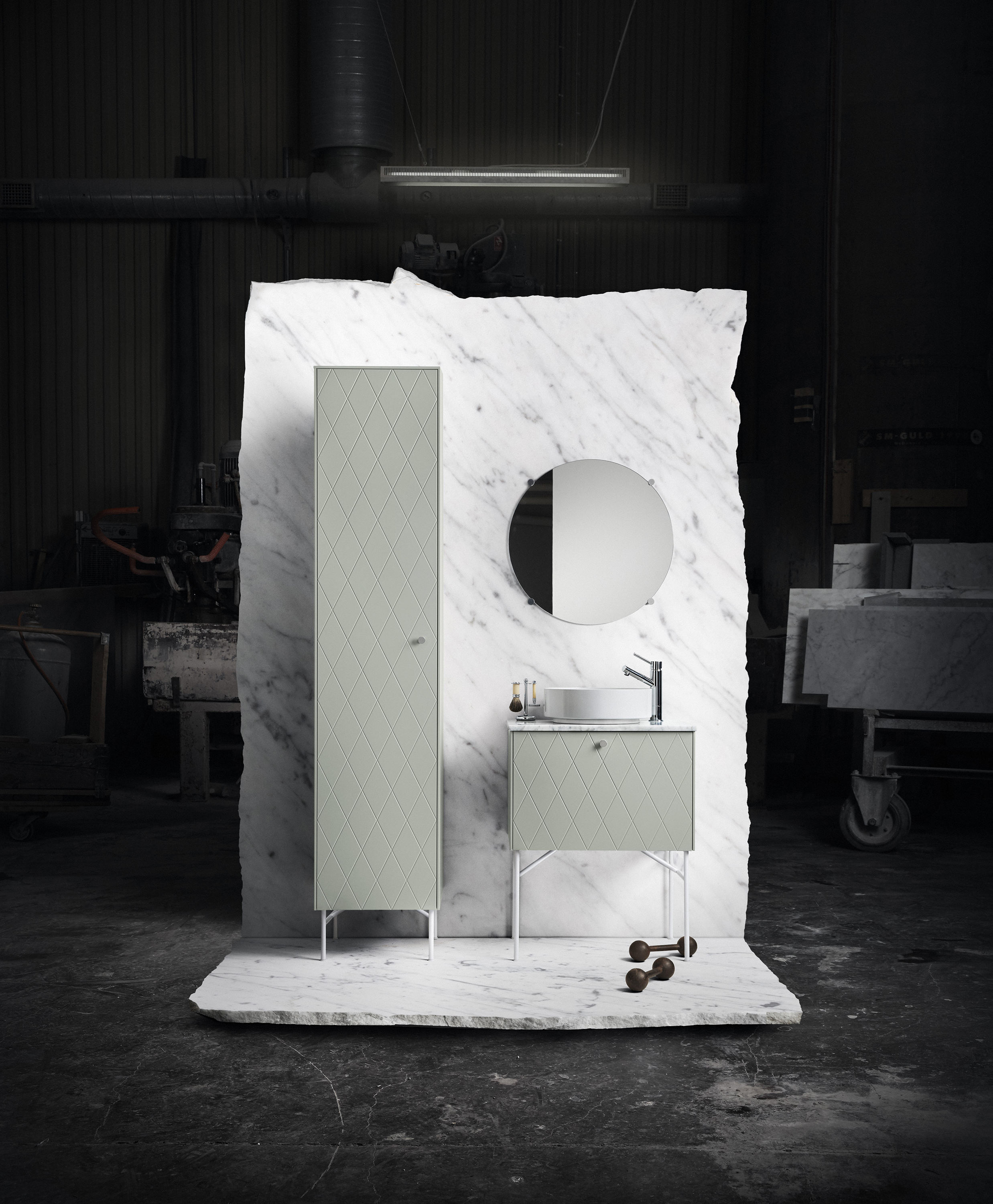 Fronts PLAIN Cloudy Wood / Sides Cloudy Wood / Top Carrara Marble / Handles PHARMACY Aluminium / Legs SLENDER HIGH Steel / Sink ALAPE ENAMEL 32 White/Steel / Mixer tap TAPWELL EVO Chrome