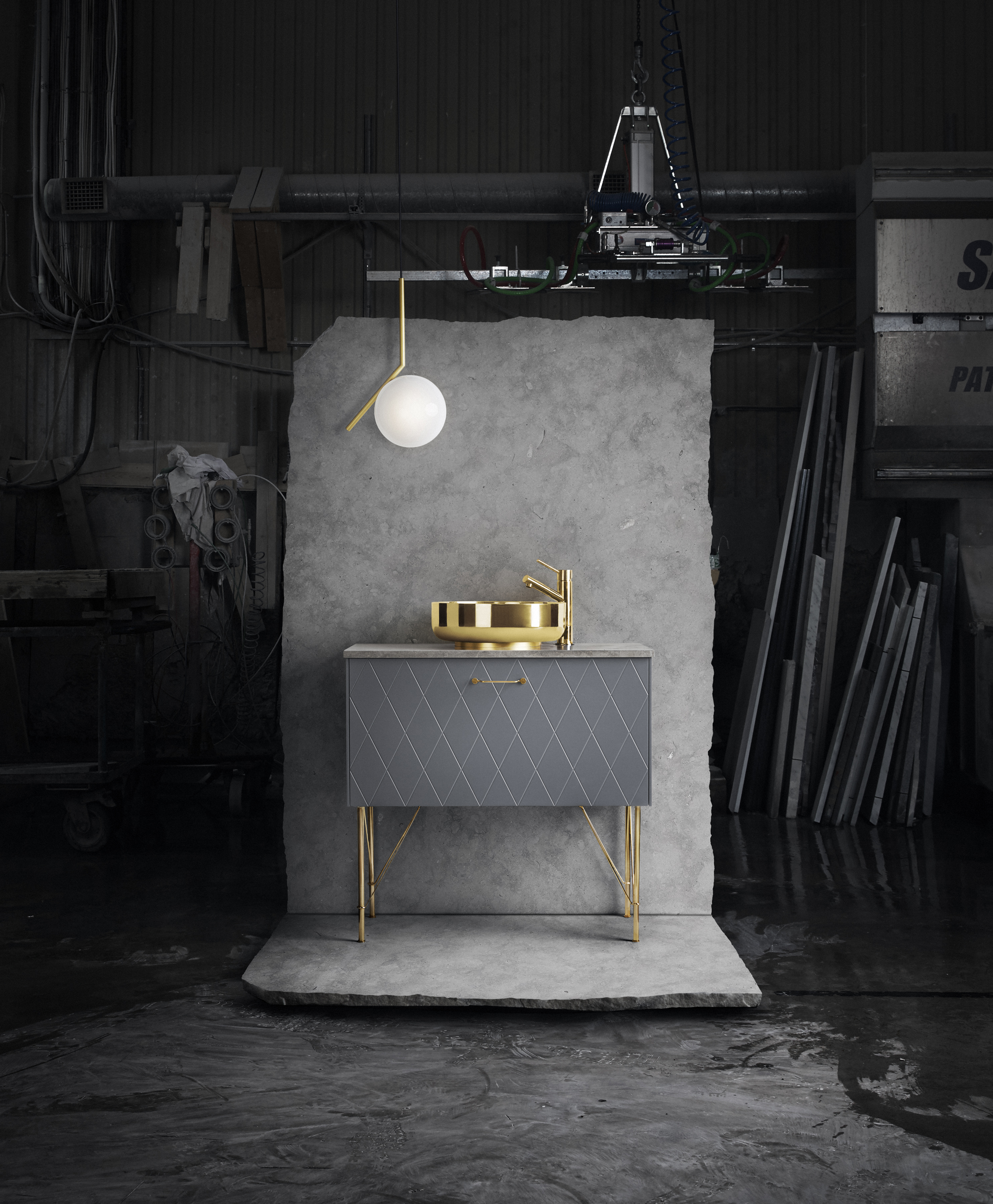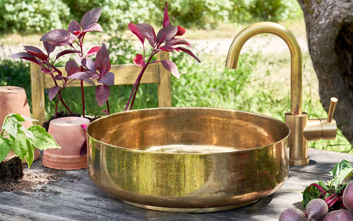 Fronts VERTICAL Biscotti Wood / Sides Biscotti Wood / Top Limestone / Handles EXTRA LONG MINI CIRCUS Brass / Legs ANGLES LOW Brass / Sink SUPERSINK Brass / Mixer tap TAPWELL EVO Brass