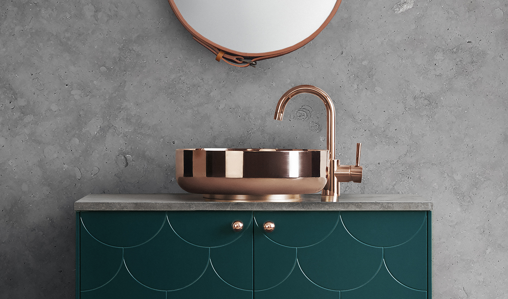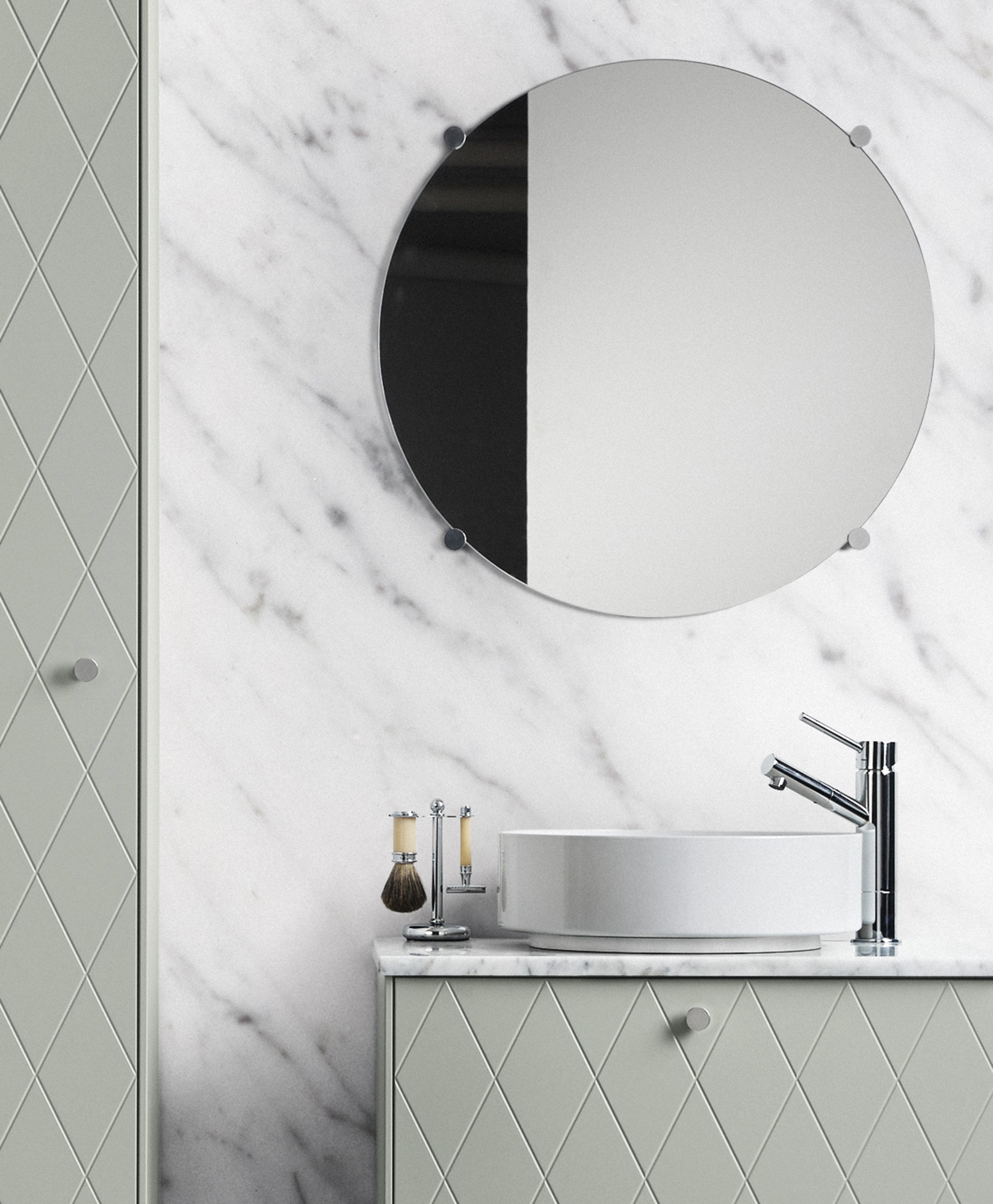 Fronts HARLEQUIN Aerugo Green / Sides Aerugo Green / Tops Aerugo Green and Carrara Marble / Handles MINI CIRCUS Aluminium / Legs ANGLES HIGH & LOW White / Sink ALAPE ENAMEL 37 / Tap TAPWELL BIRILLO Chrome