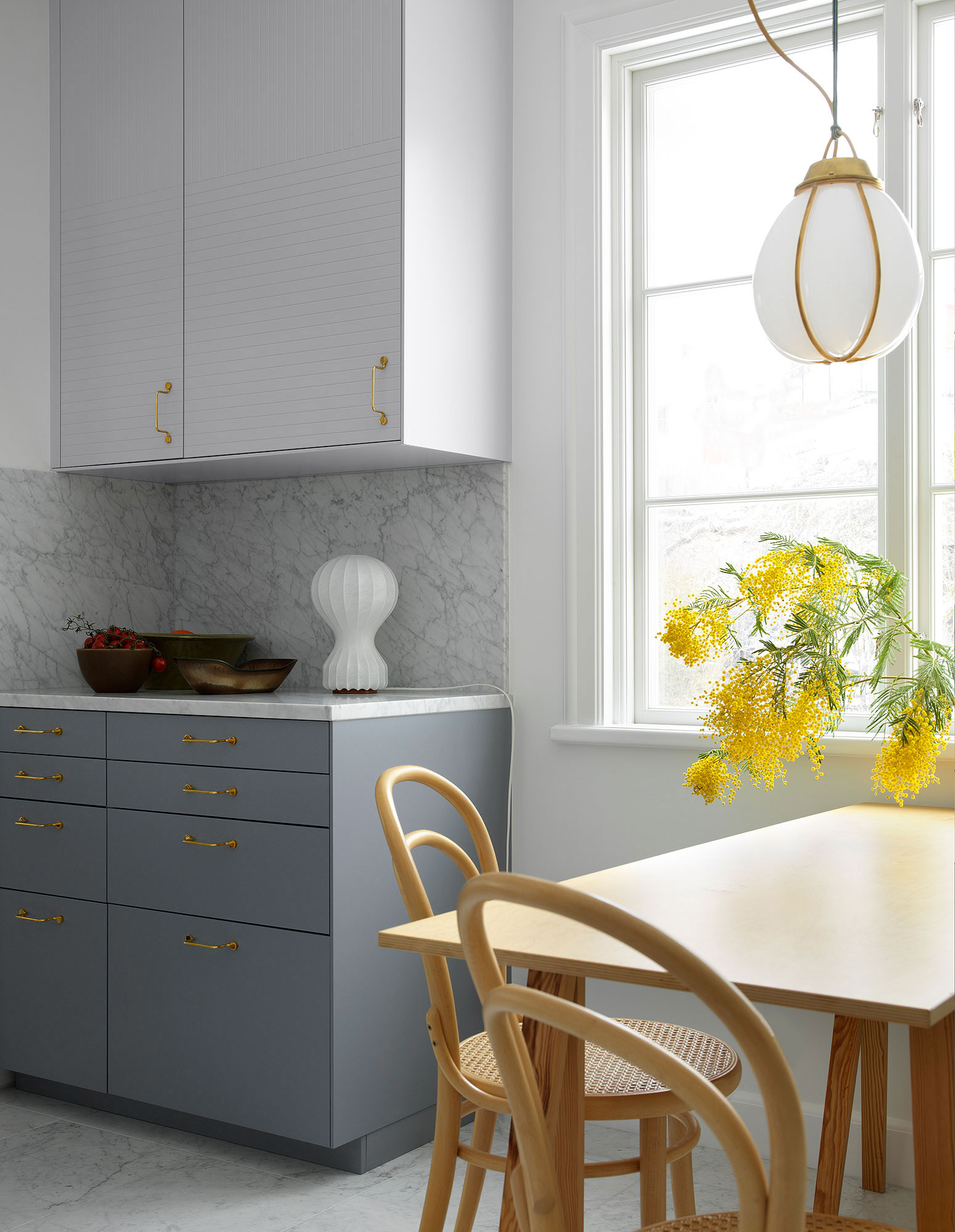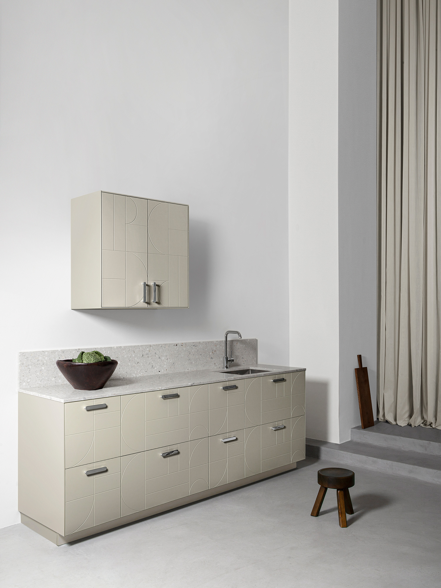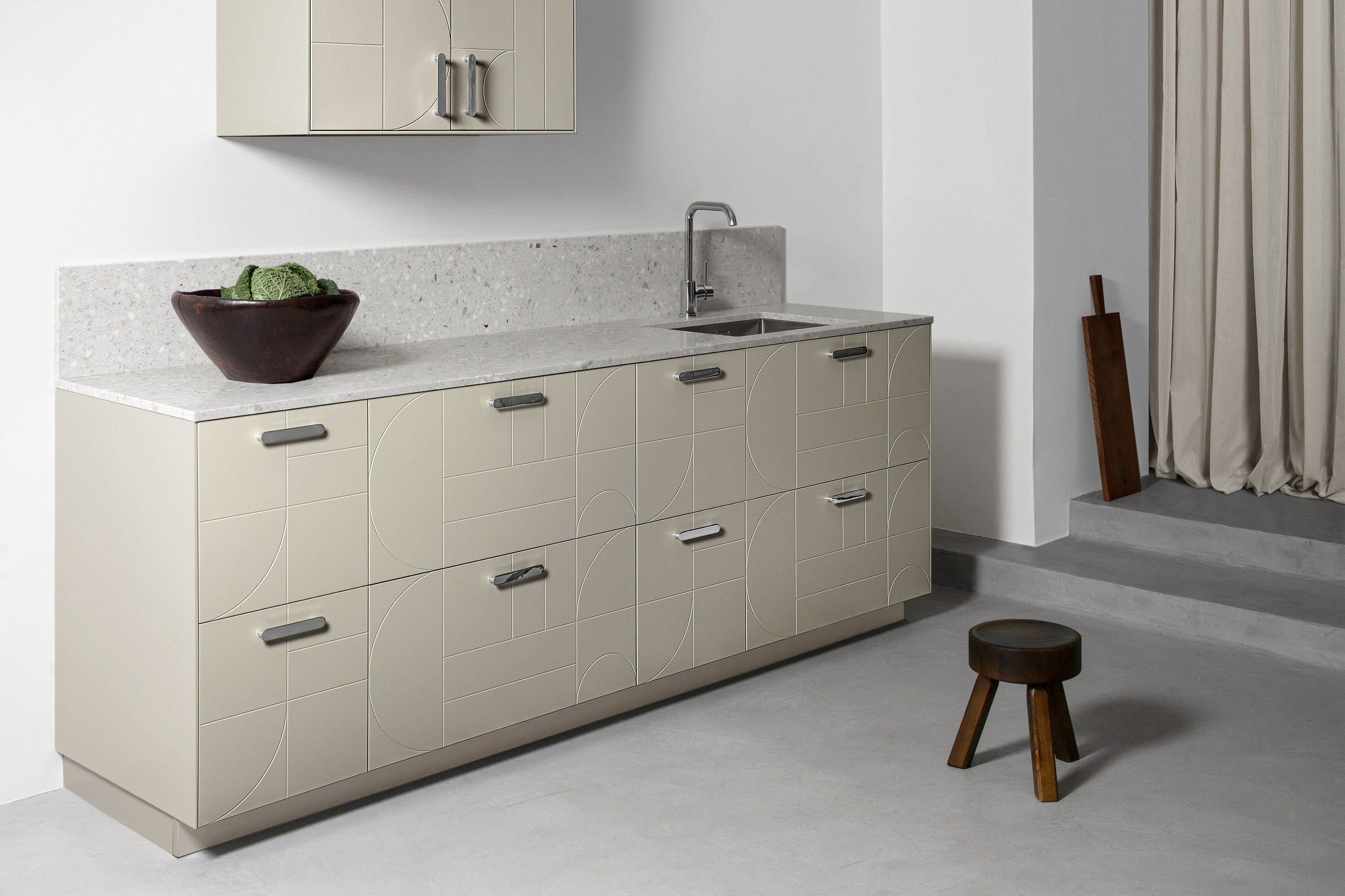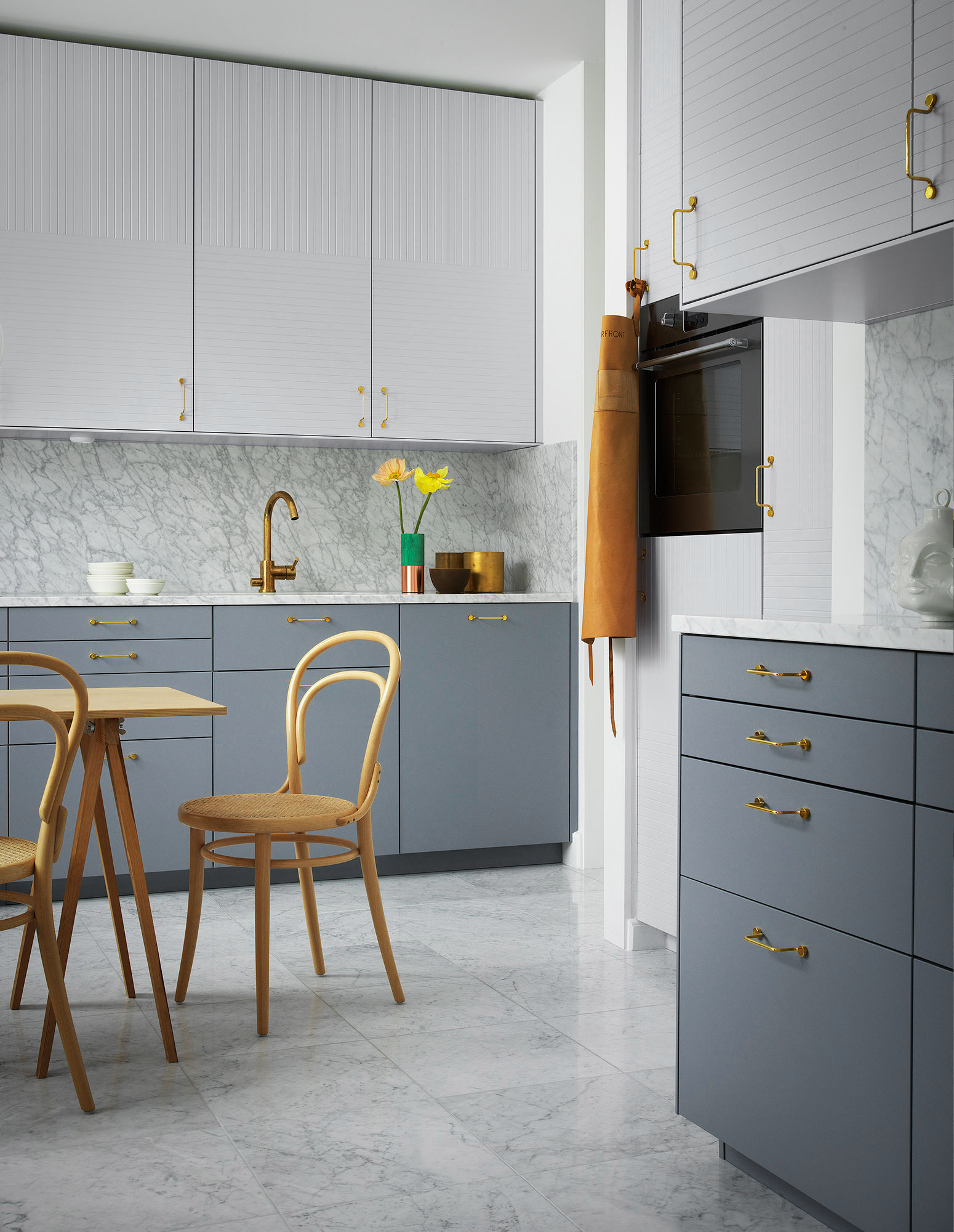 Doors and drawers PARALLELS Ashton Grey / Doors and drawers NO PATTERN Cloudy Grey / Handles WIRE Brass