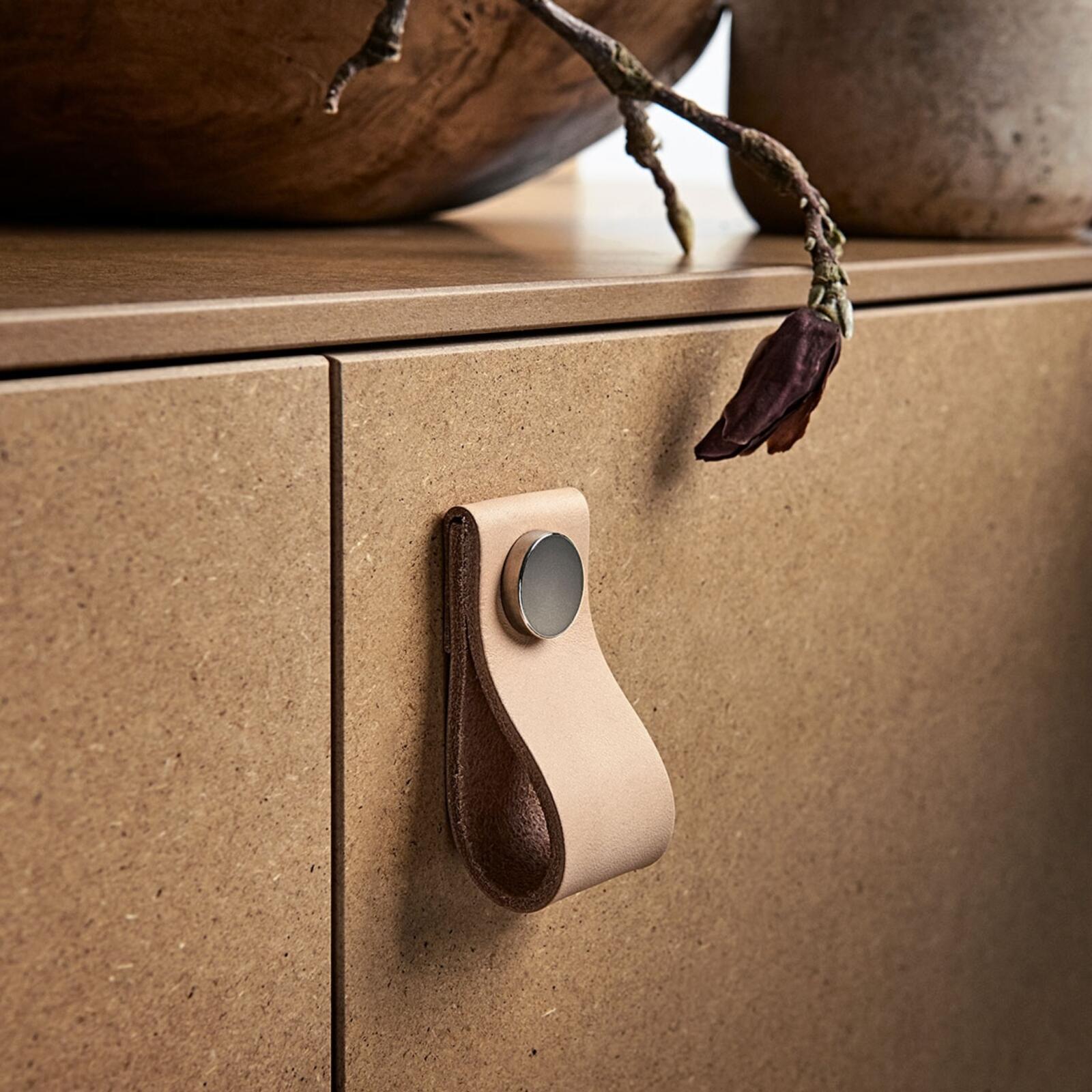 Loop-handtaget är tillverkat i obehandlat, vegetabiliskt garvat Tärnsjö-läder och åldras därför vackert. De ljusa färgerna mörknar med tiden. Välj nit i mässing, koppar, mattsvart eller förkromad mässing som liknar polerat stål. Nitarna i mässing och koppar är obehandlade vilket även ger dessa en fin patina med tiden. För att ge våra Loop-handtag en arbetad känsla har vi låtit tunna ut en av de två ändarna på läderbiten så att denna går över den andra kortänden och därmed omsluter den råa ytan som annars skulle vara synlig där. Små detaljer är det som gör stor skillnad!