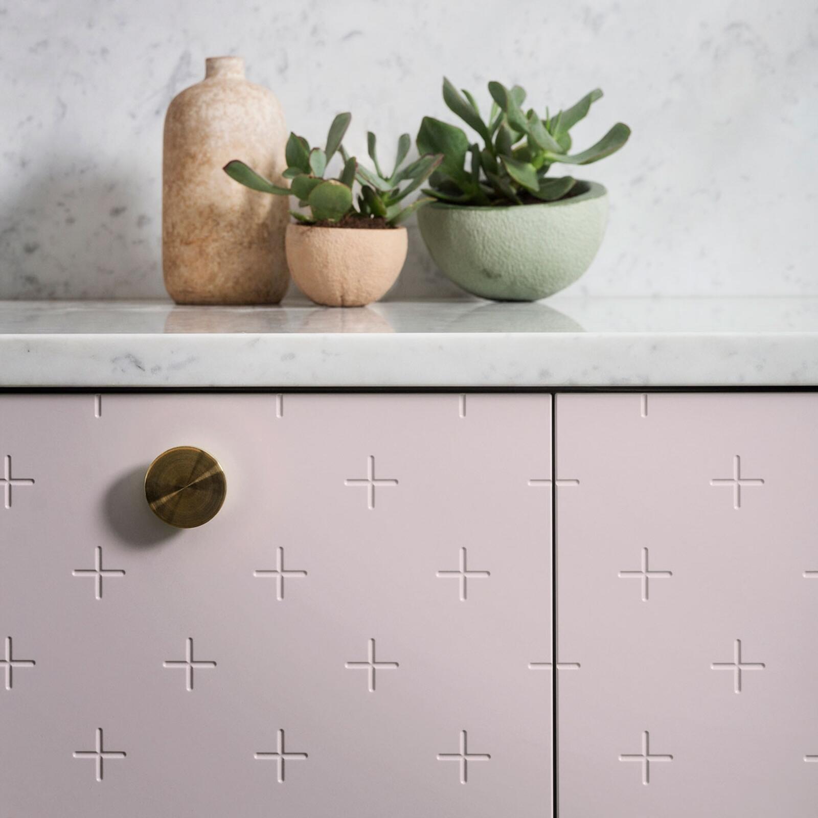 De små nedsänkta plustecknen skapar en illusion av mjukhet i den hårda ytan - som i en stoppad möbel.